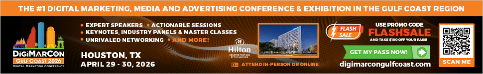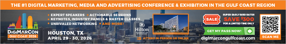 The 8th Annual DigiMarCon Gulf Coast—the leading Digital Marketing, Media, and Advertising Conference & Exhibition in Gulf Coast United States—returns April 29th to 30th, 2026, to the luxurious Hilton Houston Post Oak by the Galleria Hotel in Houston, Texas. Join industry leaders, innovators, and peers in-person or online for 2 action-packed days of cutting-edge strategies, emerging trends, and game-changing technologies in AdTech, MarTech, SaaS, and more.
